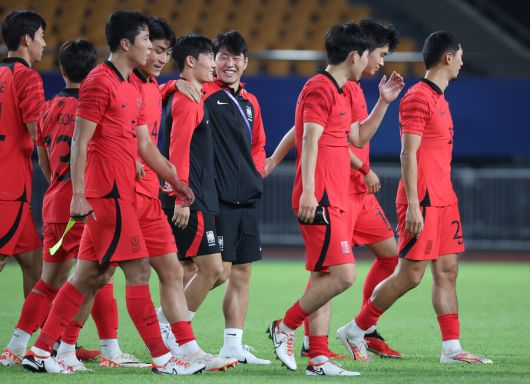 바레인과 경기를 하루 앞둔 23일 중국 항저우 진화 제일중학교 경기장에서 열린 훈련에 참석한 이강인은 연신 싱글벙글했다.