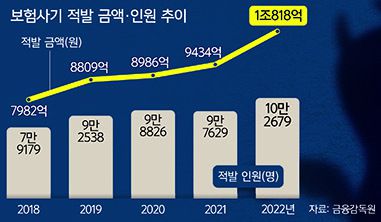 지난해 한 해 동안 금융당국이 보험사기로 적발한 금액이다. 보험사기 적발액이 1조원을 넘어선 것은 사상 처음으로, 적발 인원도 10만명대를 기록했다. 갈수록 늘어나는 보험사기에 대응하기 위해 2016년 ‘보험사기 방지 특별법’이 제정·시행됐으나 적발액은 2016∼2018년 7000억원대에서 2019∼2020년 8000억원대, 2021년 9000억원대로 올라서는 등 여전히 증가 추세를 보이고 있다.