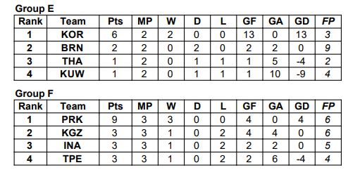 하지만 대반전이 일어났다. 조별리그 최종전서 북한이 인도네시아를 1-0으로 누르고 키르기스스탄이 대만에 4-1로 승리를 거둔 것이다. 북한이 3전 전승 조 1위로 16강에 오른 가운데 나머지 3팀이 1승2패로 승점 동률을 이뤘다.