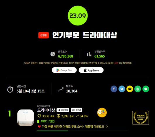 25일 오후 1시 57분 현재 연인은 3538득표(34.3%)로 쟁쟁한 국내 드라마중 1위에 랭크돼있다. 2위는 tvN '사랑의 불시착'(3485득표, 33.8%)이다.