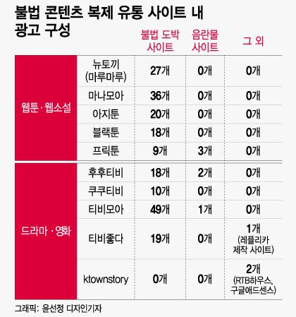 불법 웹툰·웹소설 유통 사이트 중 △뉴토끼(마루마루)는 메인 화면에만 도박 사이트 27개 △뉴토끼 대체 사이트 '마나모아'에서는 36개의 도박 사이트 △프릭툰에는 도박 9개와 성인물 3개 △스카이툰에는 2개의 도박 사이트와 4개의 성인물 사이트 광고가 있었다. 또 △아지툰(20개) △늑대닷컴(17개) △펀비(9개) △툰사랑(9개) 등에도 불법 도박 배너 광고가 여럿이었다.