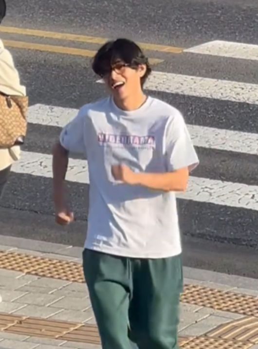 흰 티셔츠와 청바지를 입은 편안한 옷차림으로 길거리에서 포착된 뷔가 눈길을 끈다. 민 대표는 뷔를 보며 옅은 웃음소리를 내기도 했다.