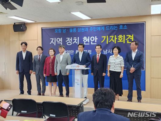 [포항=뉴시스] 강진구 기자 = 국민의힘 전 당직자로 구성된 경북 포항 남구를 사랑하는 모임(남사모)과 전·현직 시의원이 활동 중인 영일만희망포럼은 25일 오전 시청에서 동시 기자회견을 열어 "국민의힘은 포항남·울릉 지역구 김병욱 의원을 공천 배제해야 한다"고 밝혔다.