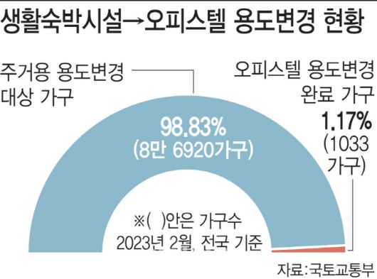 생숙의 용도변경 현황을 보면 주거용 용도변경 대상 가구는 2월 기준 8만 6920가구로 이 중 오피스텔 용도변경 완료 가구수는(1033가구) 1.17%에 불과하다. 용도변경이 1%에 그친 이유는 허가권자가 여러 기관에 뿔뿔이 흩어져 있어서다. 현재 생숙의 주거 제한은 국토부(건축정책관) 담당 업무다. 숙박시설의 숙박업 등록 신고를 규제하는 부서는 보건복지부다. 생숙의 주거형 오피스텔 용도변경 정책에서 허가권자는 각 지방자치단체장이다. 용도변경 전제 조건에 지구단위계획 변경이 필요한 경우도 지자체가 담당한다. 용도변경을 신청·검토하는 단계에서 관계부서는 다양한 영역으로 확장돼 소방·교육·교통 등 관련법의 모든 규제를 피할 수 있어야 한다. 일반 민간인이 수행할 수 없는 정책이었다는 주장에 힘이 실리는 이유다.