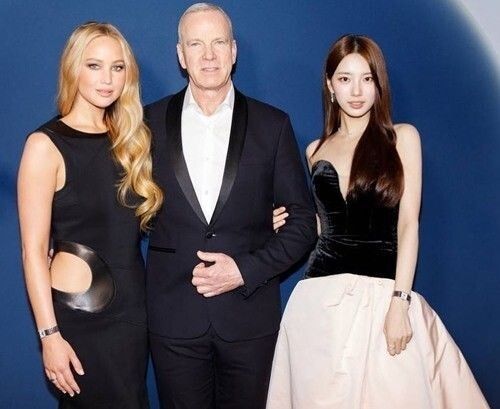 공개된 사진에는 한 브랜드의 행사장에서 할리우드 배우 제니퍼 로렌스와 포즈를 취하는 수지의 모습이 담겼다. 블랙 앤 화이트의 우아한 드레스로 미모를 뽐내고 있다.
