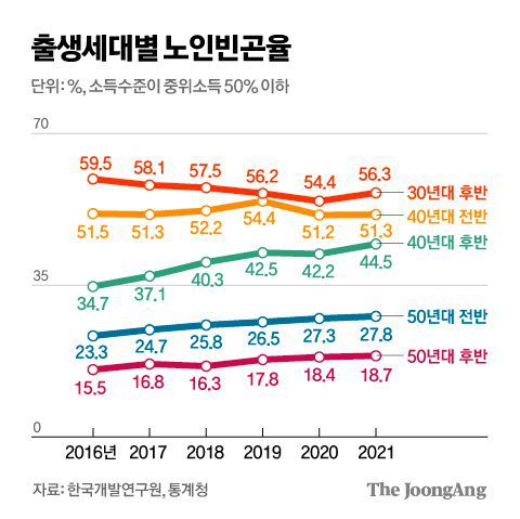 출생연도에 따른 빈곤율 차이는 크게 벌어졌다. 특히 1950년 출생자를 전후로 노인빈곤율 차이가 벌어졌다. 자산은 제외하고 소득만 따져봤을 때 1930년대 후반이나 1940년대 초반 출생 세대는 2021년 기준 빈곤율이 50%가 넘었다. 반면 60대 중후반에 해당하는 1950년대 후반 출생 세대의 빈곤율은 18.7%로, 1930년대 후반 세대(56.3%)의 3분의 1에 불과했다. 최근 고령층에 신규 진입하는 세대는 “한국 노인은 가난하다”는 통념과 맞지 않았다.