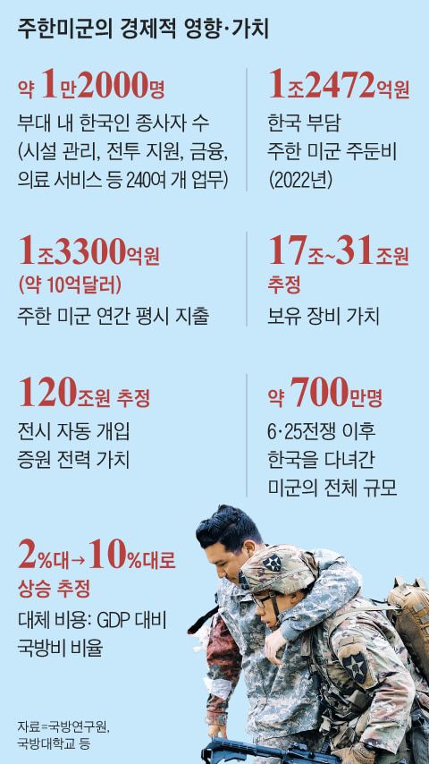 국방대학원에 따르면 주한미군이 보유한 장비들의 가치를 금액으로 환산하면 17조~31조원에 달하며 이를 대체하려면 23조~36조원 이상의 비용이 소요된다. 주한미군뿐만 아니라 전쟁 발생 시 자동 개입하는 미 증원전력의 가치만 해도 120조원 이상에 달한다.