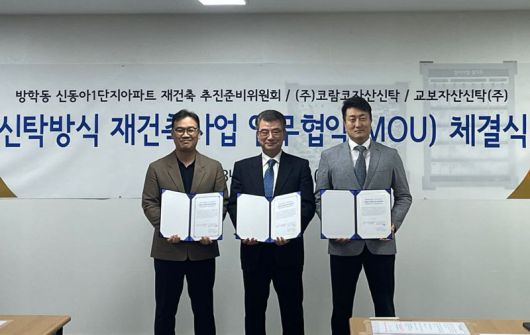 이날 업무협약식에는 김제균 재건축 추진준비위원장, 코람코자산신탁 장순서 정비사업본부장, 교보자산신탁 진영무 도시재생사업본부장 등이 참석했다.