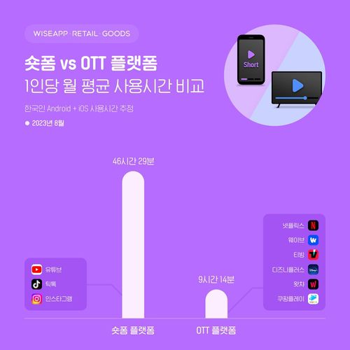 와이즈앱이 한국인 스마트폰 사용자(안드로이드+iOS)를 표본 조사한 결과 지난 8월 유튜브·틱톡·인스타그램 등 숏폼 플랫폼의 1인당 월평균 사용 시간은 46시간 29분으로 넷플릭스·웨이브·티빙·왓챠·쿠팡플레이 등 OTT 플랫폼의 1인당 월평균 사용 시간 9시간 14분 대비 5배 이상 많은 것으로 파악됐다.