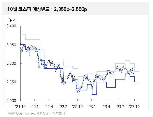 하지만 기업 미래가치가 각성되려면 불확실성의 제거가 필요하다고 했다. 강 연구원은 “10월 주식시장은 3분기 거시경제의 진단, 경기 상황을 고려한 통화정책의 미세조정, 여름 이후 개선될 것이라 확신했던 수출과 주력산업의 실적 동향을 체크하며 현재 주가수준의 평가가 진행될 것”이라고 전망했다. 10월 코스피 예상밴드는 2350포인트~2550포인트를 제시했다.