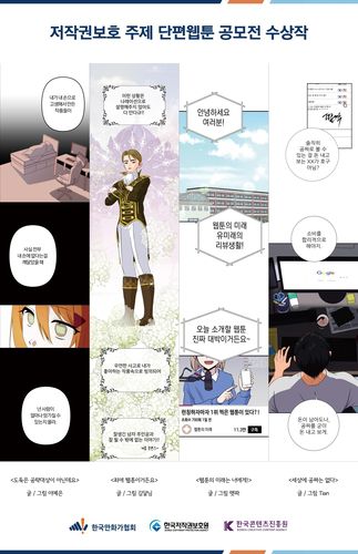 한국만화가협회와 한국저작권보호원, 한국콘텐츠진흥원은 26일 '2023 저작권 보호 주제 단편 웹툰 제작 지원 공모전'에서 '도둑은 공략 대상이 아닌데요'(이예은), '최애 웹툰이거든요'(김달님), '웹툰의 미래는 너에게!'(김소현), '세상에 공짜는 없다'(배가혜) 등 4편이 우수작으로 선정됐다고 밝혔다.