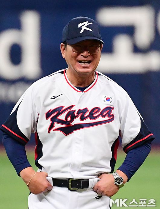 경기에 앞서 대표팀 류중일 감독이 선수들의 훈련 모습을 지켜보면서 미소짓고 있다.