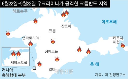 세바스토폴 해군 사령부와 사키 공군기지 등에는 지난 20일부터 23일까지 사흘 연속 우크라이나군의 미사일이 떨어졌다. 우크라이나군이 장교 34명을 사살했다고 밝힌 지난 22일에는 12차례나 미사일 공격이 단행됐다.
