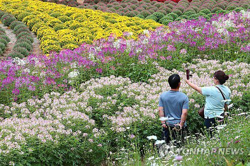 (인제=연합뉴스) 박영서 기자 = 26일 강원 인제군 북면 용대관광지 일대에서 열린 '가을꽃축제'에서 관람객들이 추억을 만들고 있다. '인제에서 꽃길만 걷자'를 테마로 열린 이번 축제는 다음 달 15일까지 이어진다. 2023.9.26