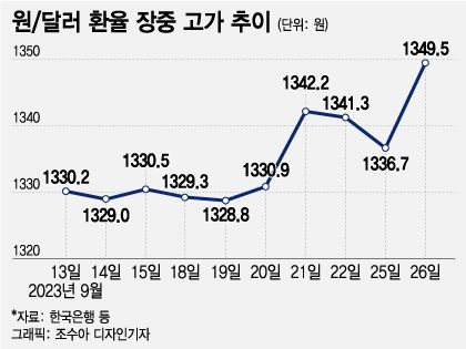 26일 서울 외환시장에 따르면 이날 원/달러 환율은 1349.5원까지 오르며 장중 고점(8월 17일 1343.0원)을 두 달 여 만에 갈아치웠다. 지난해 11월 23일(장중 1355.3원) 이후 약 10개월 만에 최고 수준이다.