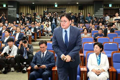 홍 원내대표는 지난 4월 민주당 원내대표 선거에 나섰으나 박광온 전 원내대표에게 고배를 마셨다. 박 전 원내대표는 결선투표 없이 압도적으로 상대 후보를 눌렀다. 박 전 원내대표가 이재명 대표의 체포동의안 가결 책임을 지고 사퇴하고 다시 도전해 민주당 원내대표직에 당선됐다.