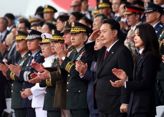 윤석열 대통령이 26일 경기도 성남 서울공항에서 열린 건군 제75주년 국군의날 기념식에서 분열을 지켜보며 거수경례하고 있다. 2023.09.26. 대통령실통신사진기자단