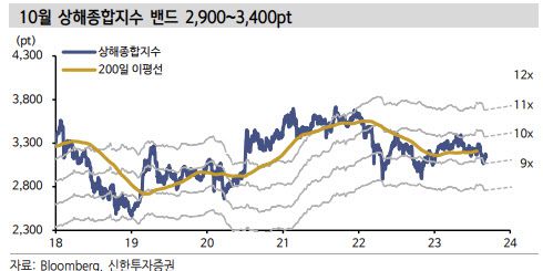 10월 상하이종합지수 밴드는 12개월 선행 주가수익비율(PER) 9.5~11.0배를 반영해 2900~3400포인트로 전망한다. 가격매력은 3100포인트 이하 구간에서 부각되며 연말로 갈수록 이익 개선에 따른 지수 상단 확장을 기대할 수 있다고 봤다.