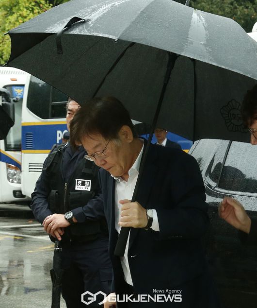 ▲26일 오전 서울중앙지방법원에 출석하는 이재명 더불어민주당 대표.