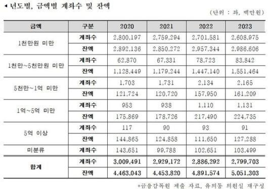 반면 이 기간 5억원 이상 미성년자 예적금은 계좌 수는 26개, 잔액은 175억원 감소했다. 1000만원 미만 예적금은 잔액은 944억원 증가했지만 계좌 수는 19만1222개 줄었다.