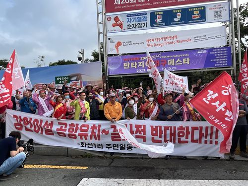 (대구=연합뉴스) 황수빈 기자 = '경북 의성군 비안면 소음공해피해 대책위'는 27일 대구시청 산격청사 앞에서 집회를 열고 대구경북(TK) 신공항 유치 취소를 요구했다.