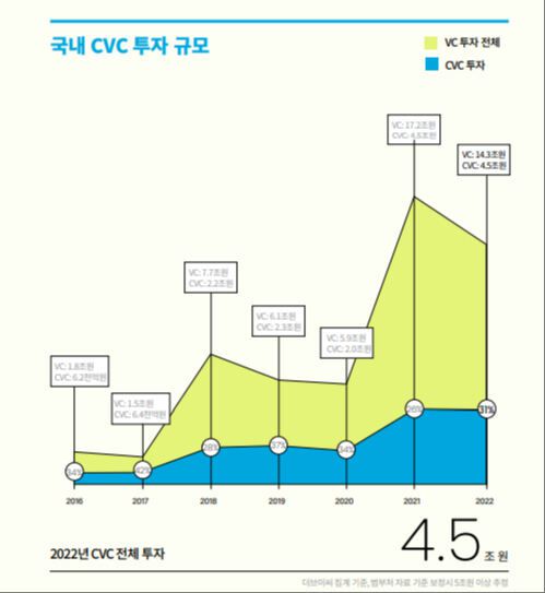 리포트에 따르면 지난해 경기침체로 2021년 17조2000억원에 달하던 전체 VC 투자 규모가 지난해 14조33000억원으로 17% 감소했다. 그런데 CVC 투자 규모는 2021년에 이어 2022년에도 4조5000억원으로 전년과 유사한 수준을 유지했다. 이는 전체 VC 투자 대비 31% 수준에 달한다.