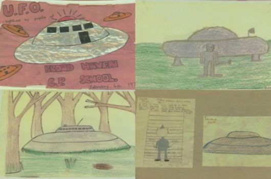1977년 영국 웨일스의 브로드 헤이븐 초등학교 어린이들이 그린 비행접시 그림들. 교장 선생님은 아이들에게 따로따로 집에서 그려오라고 했는데 모두들 비슷한 접시 모양을 그려 와 놀랐다고 했다. |