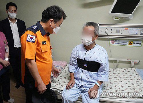 (서울=연합뉴스) 남화영 소방청장이 27일 부산 사상구 큰솔병원을 찾아 지난 1일 부산 목욕탕 폭발 화재로 입원 치료 중인 서인성 부산진소방서 소방위의 건강 상태를 살피며 위로하고 있다. 2023.9.27 [소방청 제공. 재판매 및 DB 금지]