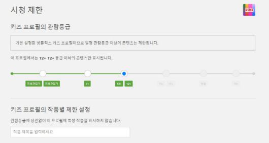 넷플릭스는 각 프로필마다 허용 가능한 콘텐츠 관람등급을 설정할 수 있으며, 이를 통해 프로필 설정에 맞는 등급 이하의 콘텐츠만 노출시킨다. 예를 들어, 관람 등급을 전체관람가에서 7+ 등급까지 설정할 경우, 이보다 높은 등급의 콘텐츠에 대한 접근이 모두 차단되어 성인 보호자 없이도 아이들이 안전하게 콘텐츠를 시청할 수 있다.