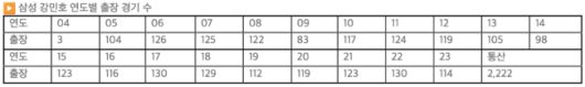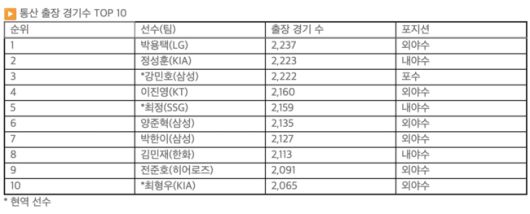 통산 출장 경기수 10위 이내 선수 중 포수 출신은 강민호가 유일하다. 포수로는 독보적인 경기 출장수다.
