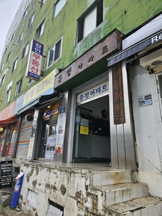 지난 26일 오후 방문한 충정아파트는 외관 곳곳에 벗겨진 페인트칠에서 세월의 흔적을 느낄 수 있었다. 비가 오는 흐린 날씨 탓에 외벽 곳곳에 갈라진 자국이 유독 선명하게 드러났다. 1937년 일제강점기에 지어져 86년을 서울 도심에서 버텨왔다. 입구에는 ‘충정아파트’ 현판이 붙어 있었고, 유리문에는 구조안전 위험시설물이라는 점을 알리는 노란 게시물이 붙어 있었다.