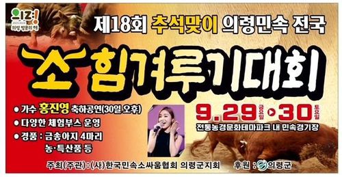 의령군은 지역 내 전통농경문화테마파크 내 민속경기장에서 29일부터 이틀간 제18회 추석맞이 의령 민속 소 힘겨루기대회를 개최한다.