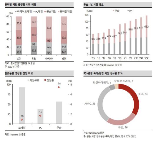 남효지 SK증권 연구원은 “콘솔 플레이 비중은 미주·유럽에서 약 40%, 전체 시장 규모는 77조 원으로 평가된다. 콘솔 게임 시장 성장률은 7.4%로 전 플랫폼 중 가장 높은 성장률을 보일 것으로 전망되고 있다”라며 “콘솔게임 시장 성장과 함께 크로스 플랫폼 지원도 확산하고 있다. 최근 대작들이 PC와 콘솔, 모바일을 지원하며 플랫폼 간 경계가 흐려지고 있다”고 짚었다.