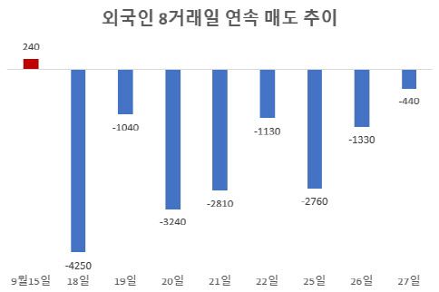 외국인 자금 유입, 투심 회복에 기여할 것으로 기대했던 WGBI이 불발되면서 10월 증시 불안감은 커질 전망이다. 특히 우려되는 건 최근 외국인 자금 유출 추세다. 외국인은 지난 27일에도 순매도하며 지난 18일부터 이어진 8거래일 연속 순매도를 이어갔다. 지난 18~27일 8거래일간 외국인이 팔아치운 총금액(코스피·코스닥 및 ETF·ETN·ELW 총합)은 1조7000억원에 달한다.