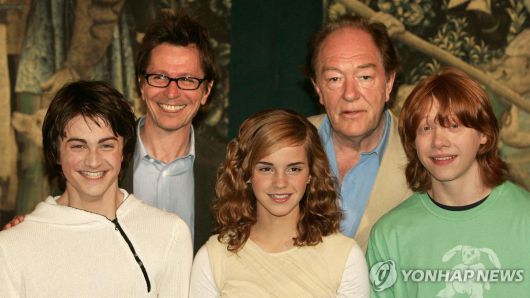 2004년 '시리우스 블랙' 역의 게리 올드먼(왼쪽 상단부터 시계방향)과 '해리 포터' 대니얼 래드클리프, '헤르미온느' 에마 왓슨, '론 위즐리' 루퍼트 그린트가 '덤블도어 교수' 갬본과 함께 포즈를 취하고 있다. /로이터연합뉴스 |