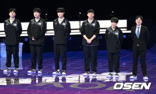 [OSEN=항저우(중국), 김성락 기자] 29일 오후 중국 항저우시 궁수구 항저우 e스포츠 센터에서 '제19회 항저우아시안게임' 리그 오브 레전드(LoL) 대한민국과 대만의 결승전 경기가 열렸다. 경기 시작에 앞서 한국 대표팀이 관중에게 인사하고 있다. 2023.09.29 / ksl0919@osen.co.kr