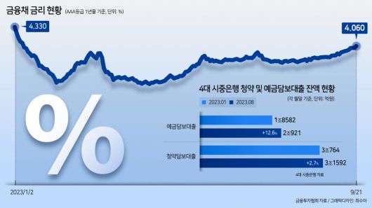 30일 금융권에 따르면 4대 시중은행(KB국민·신한·하나·우리)의 예금담보대출(청약통장 제외) 잔액은 8월 말 기준 2조921억원으로 지난 1월 말(1조8582억원)과 비교해 약 2339억원(12.6%) 늘어난 것으로 나타났다. 고금리가 이어지는 상황에서 보유한 예금 이자율에 1% 내외의 가산금리만 부담하면 대출이 가능한 예담대의 매력이 부각된 영향이다. 여기다 예담대는 총부채원리상환비율(DSR) 적용에서도 예외 적용된다는 장점이 있다.