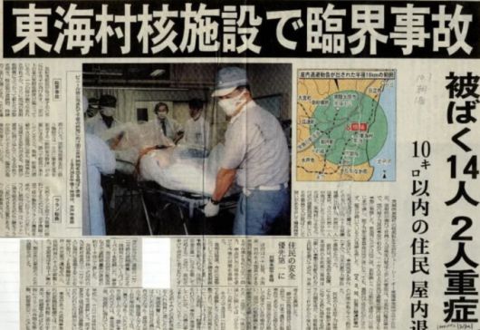 도카이 우라늄 가공 공장 폭발 사고 당시 신문 자료. |