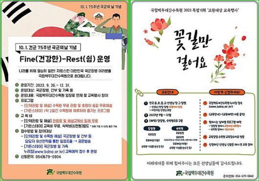 [대전=뉴시스] 국립백두대간수목원의 국군장병을 위한 'Fine(건강한)-Rest(쉼)' 프로그램 포스터와 교원을 위한 '꽃길만 걸어요' 포스터. *재판매 및 DB 금지 |