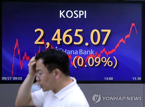 1일 한국거래소에 따르면 코스피는 지난달 27일 2,465.07에 마쳐 전주 종가(22일·2,508.13) 전보다 43.06포인트(1.71%) 하락했다.