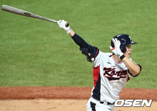 [OSEN=항저우(중국), 김성락 기자] 1일 오후 중국 항저우 사오싱 야구체육문화센터에서 '제19회 항저우아시안게임' 야구 대한민국과 홍콩의 경기가 열렸다. 4회말 1사 만루 대한민국 김혜성이 2타점 적시타를 날리고 있다. 2023.10.01 / ksl0919@osen.co.kr