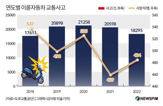 오토바이가 많아지면 교통사고도 늘어나기 마련이다. 다행히 시민 교통법규 준수와 안전 운전 교육으로 이륜차 교통사고는 최근 들어 감소했다. 도로교통공단에 따르면 전국에서 발생한 이륜차 교통사고는 2021년 2만598건에서 2022년 1만8295건으로 줄었다.