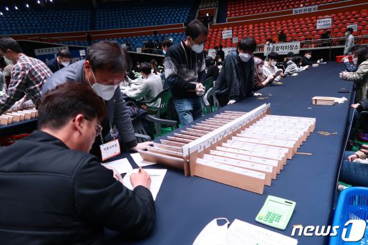 제21대 국회의원 선거 제주 제주시 한림체육관 개표소(뉴스1DB) ⓒ News1 홍수영 기자 |