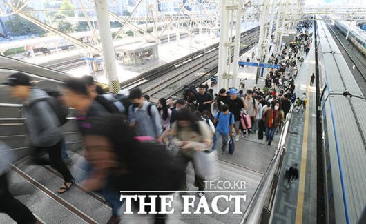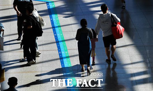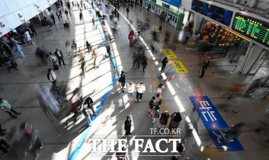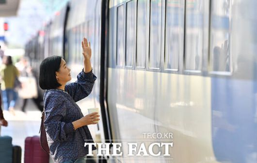 [더팩트ㅣ박헌우 기자] 추석 연휴 닷새째이자 임시공휴일인 2일 오전 서울 용산구 서울역 승강장에서 가족들이 아쉬움의 인사를 나누고 있다.