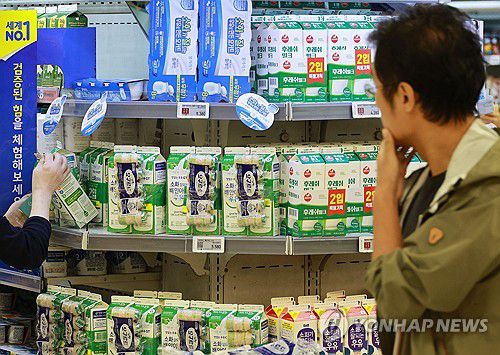 (서울=연합뉴스) 한종찬 기자 = 우유 원유(原乳) 가격 인상 여파로 1일부터 흰 우유 제품을 비롯한 유제품 가격이 일제히 오른다. 이달 우유 가격 인상 이후 우유를 재료로 쓰는 빵, 아이스크림 등의 가격이 오르는 '밀크플레이션'이 촉발될 가능성도 제기된다. 사진은 이날 서울 시내 대형마트에서 우유 판매대. 2023.10.2