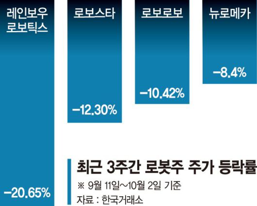 양승윤 유진투자증권 연구원은 "로봇주가 두산로보틱스 상장 기대감, 대기업들의 로봇시장 진출 소식 등에 단기간 급격히 오르면서 차익실현에 대한 수요가 커졌다"며 "대표적인 성장 섹터로 단기적 변동성이 큰 만큼 주가에 대한 투자자들의 피로감, 부담감 등도 조정을 이끈 요인"이라고 말했다.