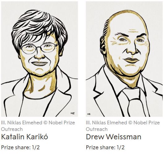 [이데일리 강민구 기자] 스웨덴 카롤린스카연구소 노벨위원회는 2일(현지시간) 올해 노벨 생리의학상을 커털린 커리코, 드류 와이즈만에게 주기로 했다고 발표했다. 커털린 커리코(왼쪽)와 드류 와이즈만(오른쪽).(사진=노벨위원회)