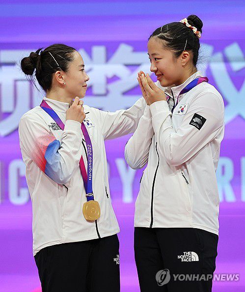 (항저우=연합뉴스) 김인철 기자 = 2일 중국 항저우 궁수 캐널 스포츠파크 체육관에서 열린 19회 항저우 아시안게임 탁구 여자 복식 결승전에서 북한 차수영-박수경을 이기고 금메달을 획득한 신유빈-전지희가 시상대에 올라 메달을 목에 걸고 있다. 2023.10.2