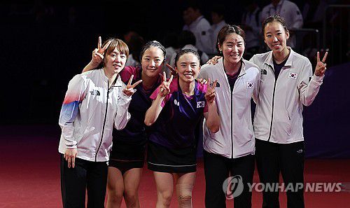 (항저우=연합뉴스) 김인철 기자 = 2일 중국 항저우 궁수 캐널 스포츠파크 체육관에서 열린 19회 항저우 아시안게임 탁구 여자 복식 결승전에서 북한 차수영-박수경을 이기고 금메달을 획득한 신유빈-전지희가 동료선수들과 기념촬영을 하고 있다. 2023.10.2