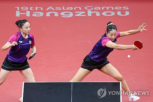 (항저우=연합뉴스) 신현우 기자 = 2일 중국 항저우 궁수 캐널 스포츠파크 체육관에서 열린 19회 항저우 아시안게임 탁구 여자 복식 결승전에서 한국 신유빈-전지희가 북한 차수영-박수경을 상대하고 있다. 2023.10.2 nowwego@yna.co.kr ▶제보는 카카오톡 okjebo▶연합뉴스 앱 지금 바로 다운받기~▶네이버 연합뉴스 채널 구독하기 <저작권자(c)연합뉴스. 무단전재-재배포금지.>